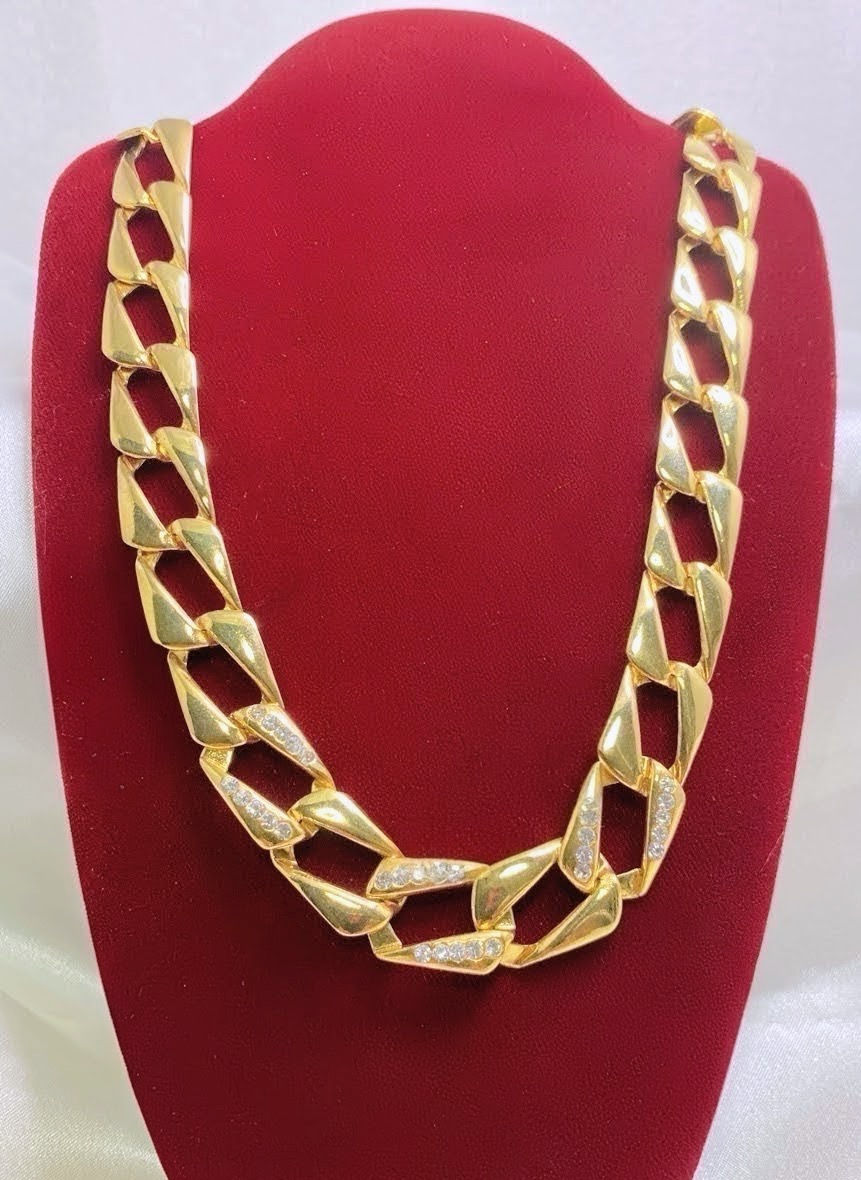 Gold Tone Cuban Link Chain Necklace with Crystal Accents – 18” Statement Chain